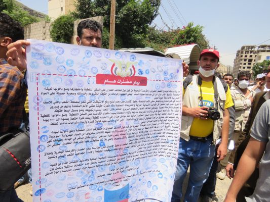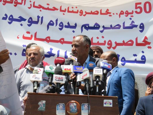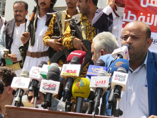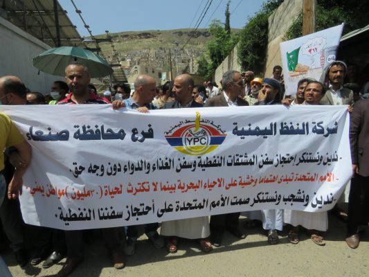 وأدان البيان الصادر عن المسيرة والوقفة الذي تلاه الناطق الرسمي باسم شركة النفط عصام المتوكل، استمرار احتجاز سفن المشتقات النفطية من قبل تحالف العدوان .. مبيناً أن قوى العدوان ما تزال تحتجز 19سفينة نفطية منها 15 سفينة تحمل 371 طنا من مادتي البنزين والديزل وذلك منذ فترات متفاوتة بلغت في أقصاها (142) يوم.