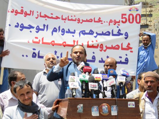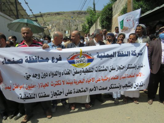وأشار الرهوي في المسيرة والوقفة الاحتجاجية التي نظمتها شركة النفط اليمنية اليوم بمرور 500 يوم على الاعتصام المفتوح أمام مكتب الأمم المتحدة بصنعاء، للمطالبة بالإفراج عن سفن المشتقات النفطية، إلى أن استمرار الحصار واحتجاز سفن المشتقات النفطية له تداعيات كارثية تطال كافة أبناء الشعب اليمني .