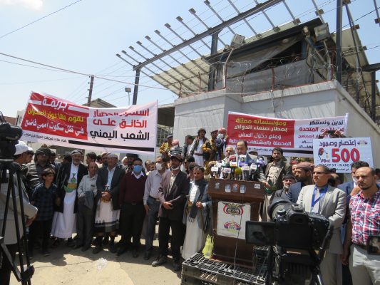 ورفع المشاركون في المسيرة التي انطلقت من شارع الستين الجنوبي وصولا إلى أمام مكتب الأمم المتحدة بصنعاء، شعارات الإدانة والاستنكار لممارسات دول تحالف العدوان التعسفية واستمرارها في أعمال القرصنة البحرية على السفن.