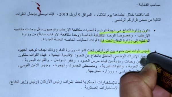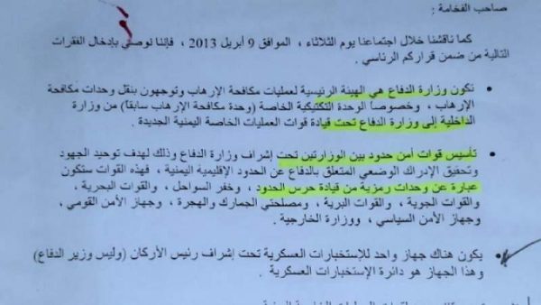 وتضمنت الوثائق الصادرة عن السفارة الأمريكية قبل الثورة توجيهات من السفير الأمريكي الأسبق جيرالد فايرستيان للرئاسة بنقل ما يسمى “وحدات مكافحة الإرهاب” من وزارة الداخلية إلى الدفاع، كما تضمنت الوثائق توجيهات أمريكية بالاقتصار على وحدات رمزية لتكون قوات أمن للحدود اليمنية البرية والبحرية.