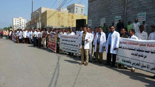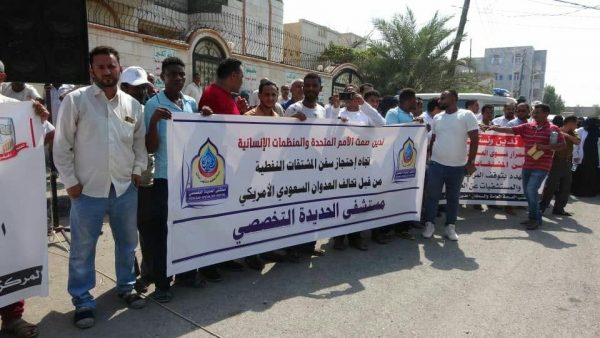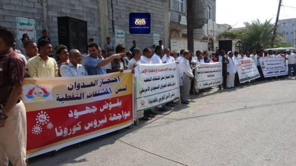 نظمت هيئة مستشفى الثورة العام وصندوق النظافة والتحسين والمؤسسة العامة للكهرباء وشركة النفط اليمنية ومستشفيات الأمل والرشيد والحديدة ومراكز الغسيل الكلوي ومختبرات الصحة المركزية ومكاتب الصحة بمديريات الحوك والحالي والميناء في محافظة الحديدة ، اليوم الأربعاء، وقفة احتجاجية حاشدة تنديداً باستمرار دول تحالف العدوان احتجاز سفن المشتقات ومنع دخولها الى ميناء الحديدة رغم استكمالها لكافة اجراءات الفحص في جيبوتي وحصولها على تصاريح من الأمم المتحدة ما ضاعف من معاناة ملايين اليمنيين.