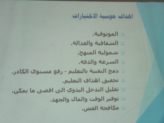 ولفت إلى أهمية نظام حوسبة الاختبارات الذي تم تطبيقه وفق أسس وخطوات علمية لما يحققه من شمولية وإنصاف تضمن للطالب الحصول على استحقاقه الفعلي دون أي انتقاص نظرا لعدم تأثر عملية التصحيح بذاتية المصحح أو الظروف المحيطة فضلا عن الدقة والسرعة في التصحيح وتقدير ورصد الدرجات واختصار الجهد والوقت والتكلفة.