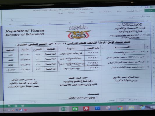 وأوضح وزير التربية والتعليم يحيى بدر الدين الحوثي في مؤتمر صحفي اليوم بصنعاء, أن إجمالي عدد الطلاب المتقدمين لإختبارات الثانوية العامة ١٩١ ألفا و٤١٣ طالبا وطالبة حضر الاختبارات ١٧٨ ألفا و ٨٨ طالبا وطالبة وغاب عنها ١٣ ألفا و٣٢٥ طالبا وطالبة ونجح ١٥٠ ألفا و٥٩٧ طالبا وطالبة فيما رسب في الاختبار ٢٧ ألفا و٤٩١ طالبا وطالبة .