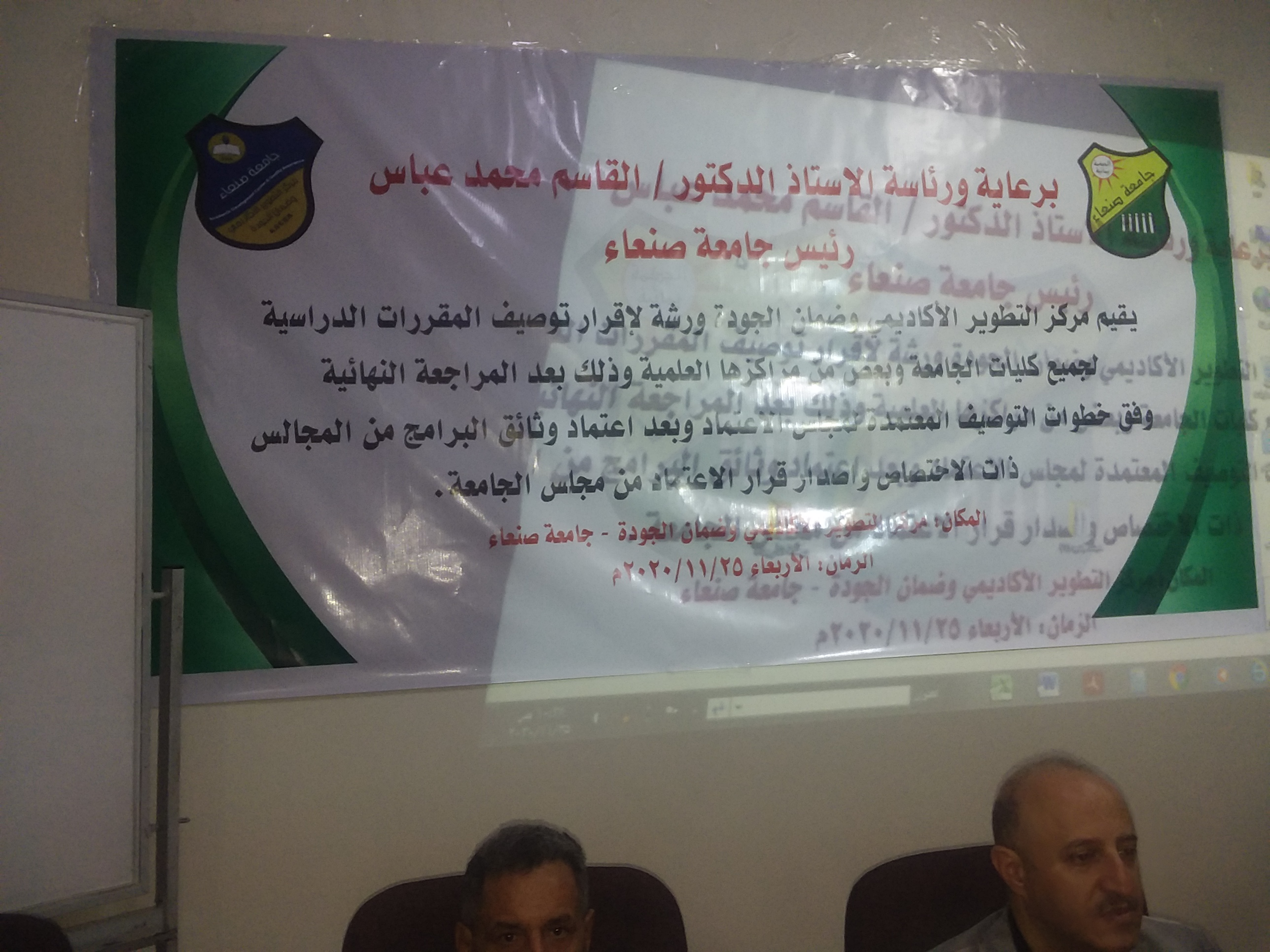 أقام مركز التطوير الاكاديمي وضمان الجودة ورشة لإقرار توصيف المقررات الدراسية لجميع كليات الجامعة وبعض من مراكزها العلمية وذلك بعد المراجعة النهائية وفق خطوات التوصيف المعتمدة لمجلس الاعتماد وبعد اعتماد وثائق البرامج من المجالس ذات الاختصاص واصدار قرار الاعتماد من مجلس الجامعة والشروع بتنفيذها بدءً من العام الجامعي 2020 – 2021 م.