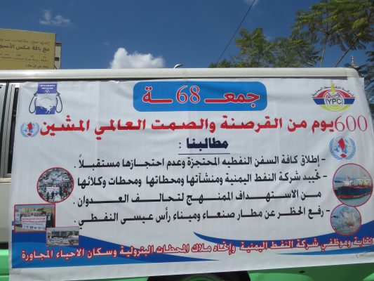 فيما طالب بيان صادر عن اللجان النقابية بشركة النفط اليمنية بضرورة إطلاق السفن النفطية المحتجزة وضمان عدم احتجازها في المستقبل، وتحييد شركة النفط ومنشآتها ومحطاتها ومحطات وكلائها من الاستهداف وكذا رفع الحظر عن ميناء رأس عيسى ومطار صنعاء الدولي .