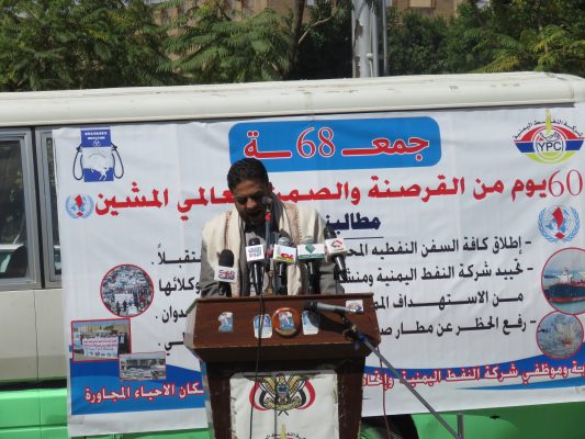 وأكد استمرار تنظيم الوقفات والاعتصامات أمام مكتب الأمم المتحدة حتي الإفراج عن جميع سفن المشتقات النفطية ومنع استهداف الشركة ووكلائها ورفع الحصار على الموانئ والمطارات.