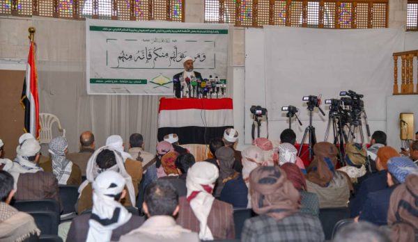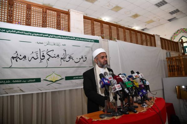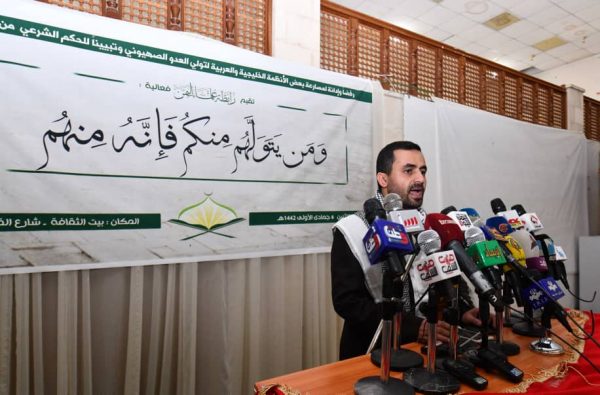 نظمّت رابطة علماء اليمن اليوم بصنعاء فعالية بعنوان” وَمَن يَتَوَلَّهُم مِّنكُمْ فَإِنَّهُ مِنْهُمْ”، رفضاً وإدانة لمسارعة بعض الأنظمة الخليجية والعربية في تولّي العدو الصهيوني وتبياناً للحكم الشرعي في ذلك.