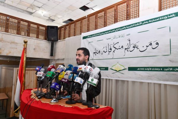وأكد رفض الشعب اليمني هرولة الدول الخليجية والمملكة المغربية والسودان في موالاة الكيان الصهيوني وتطبيع العلاقات مع العدو الغاصب للأراضي الفلسطينية .. معتبراً ذلك طعنة في خاصرة الأمة والقضية الفلسطينية وخيانة لدماء الشهداء التي سفكت من أجل عزة وكرامة الأمة عبر مراحل الصراع العربي الصهيوني.