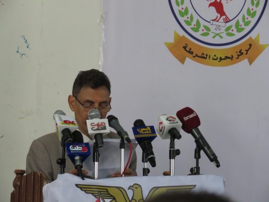 بدوره، أكد مدير مركز بحوث الشرطة، الدكتور عبده فازع الصيادي، العمل على إعداد وتنفيذ المحاور والأوراق البحثية لصناعة نهضة أمنية غير مسبوقة.. مبيناً أن مركز بحوث الشرطة يهدف من خلال المؤتمر لدراسة أسباب المشاكل والاختلالات والبحث عن معالجات وحلول جذرية.. كاشفاً عن تشكيل لجنة علمية لتحكيم الأبحاث وتقديرها بعد المؤتمر وإجازتها.
