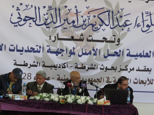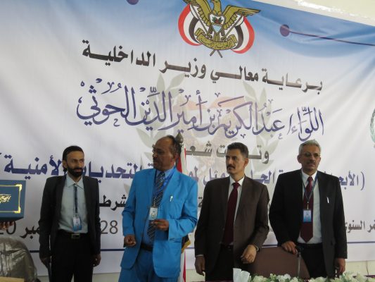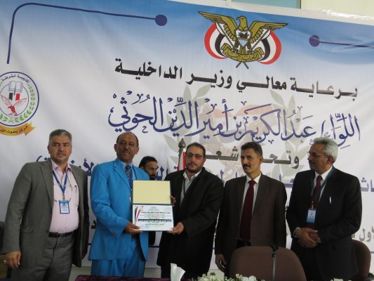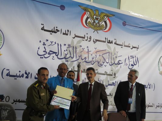 وفي فعاليات اختتام المؤتمر تم تكريم وزير الداخلية اللواء عبدالكريم أمير الدين الحوثي بدرع الأكاديمية وتكريم المشاركين في المؤتمر .