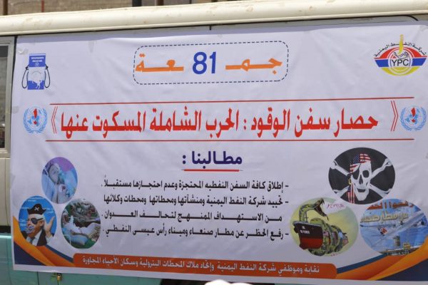 وقال “لدينا أكثر من 720 وقفة احتجاجية لأكثر من سنتين ونصف والجميع يقف أمام مكتب الأمم المتحدة للمناشدة والدعوة للإفراج عن سفن الوقود لكن دون أي تجاوب”.