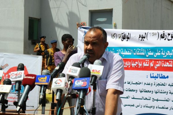 وأشار الناطق الرسمي للشركة عصام المتوكل خلال الوقفة الاحتجاجية لموظفي شركة النفط والقطاعات الحيوية والخدمية أمام مكتب الأمم المتحدة بصنعاء اليوم بحضور المدير التنفيذي للشركة المهندس عمار الأضرعي، إلى ضرورة تدخل الأمم المتحدة والقيام بواجبها في الإفراج عن سفن المشتقات النفطية وعدم احتجازها مستقبلا.