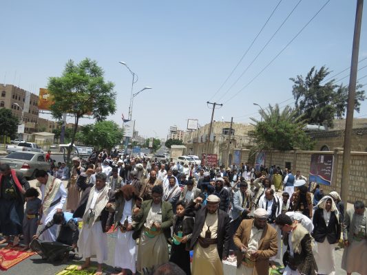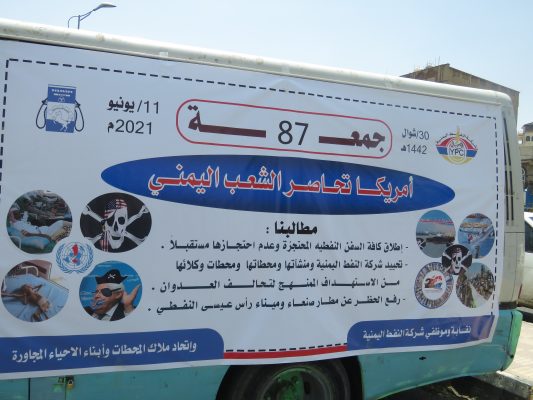 وندد بيان صادر عن اللجان النقابية بشركة النفط في الوقفة التي نظمت تحت شعار” أمريكا تحاصر الشعب اليمني” بالصمت الأممي المعيب تجاه الممارسات التعسفية لتحالف العدوان الأمريكي السعودي.