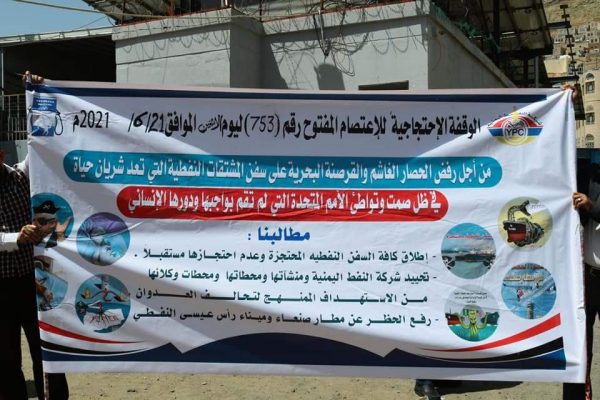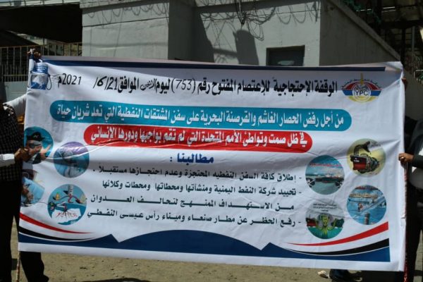 فيما أكدت اللجان النقابية لشركة النفط في بيان خلال الوقفة أن الشعب اليمني بات يعيش في وضع كارثي متفاقم نتيجة تشديد الحصار الجوي والبري والبحري على احتياجاته من النفط والغذاء والدواء .