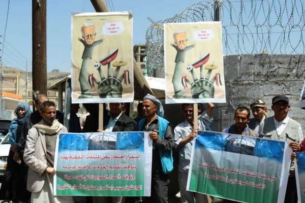 نظم قطاعا النظافة والأشغال بأمانة العاصمة وموظفو شركة النفط اليمنية اليوم وقفة أمام مكتب الأمم المتحدة تنديداً باستمرار القرصنة البحرية واحتجاز سفن المشتقات النفطية من قبل العدوان الأمريكي السعودي.
