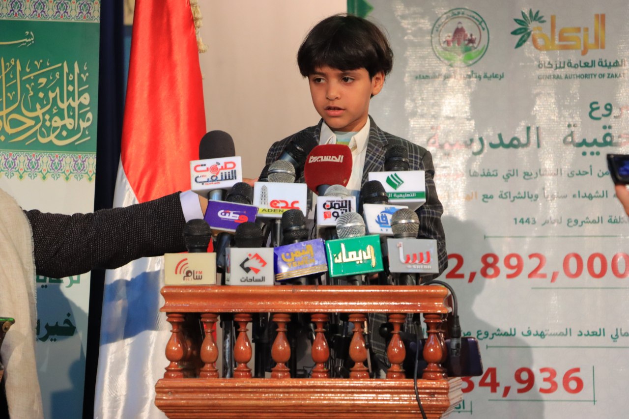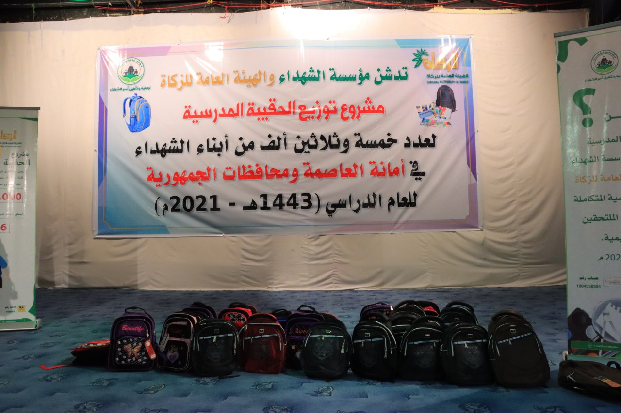 دشنت مؤسسة الشهداء بالشراكة مع الهيئة العامة للزكاة اليوم بصنعاء، مشروع توزيع الحقيبة المدرسية المتكاملة لأبناء الشهداء بأمانة العاصمة والمحافظات للعام الدراسي 1443هـ – 2021م.