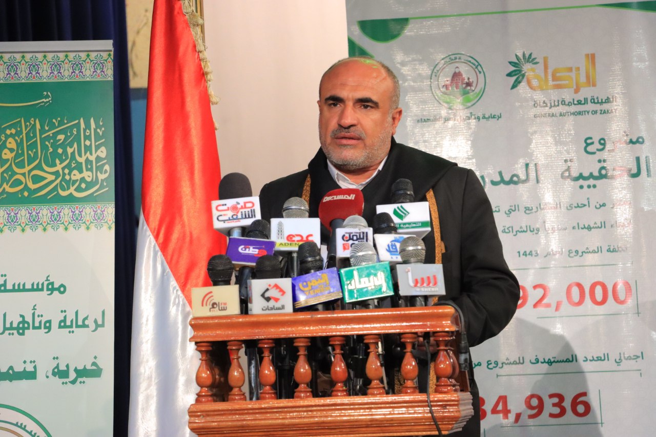 وخلال التدشين أشار عضو المجلس السياسي الأعلى أحمد الرهوي إلى أهمية المشروع في توفير احتياجات أبناء الشهداء لاستكمال تعليمهم وفاءً لآبائهم الذين بذلوا أرواحهم ودمائهم في سبيل الله والدفاع عن الوطن.