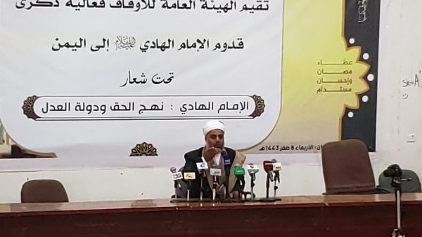 نظّمت الهيئة العامة للأوقاف اليوم الأربعاء ، فعالية خطابية بذكرى قدوم الإمام الهادي إلى اليمن بعنوان ” الإمام الهادي .. نهج الحق ودولة العدل”.
