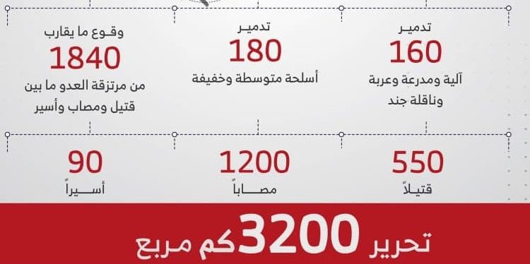 وأضاف العميد سريع أن العملية أدت إلى اعطاب واحراق وتدمير ما يقارب 160 آلية ومدرعة وعربة وناقلة جند إضافة الى تدمير 180 أسلحة ، كما نجحت قواتنا في تدمير 5 مخازن أسلحة واسقاط اربع طائرات استطلاعية منها سي اتش فور.. بالإضافة لاغتنام عشرات المدرعات والآليات.
