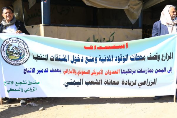 واعتبر بيان صادر عن وقفة احتجاجية لموظفي الصندوق اليوم، نُظمت بالتعاون مع موظفي شركة النفط اليمنية أمام مكتب الأمم المتحدة في صنعاء بحضور وزير الزراعة والري المهندس عبدالملك الثور والمدير التنفيذي للشركة المهندس عمار الأضرعي، الأمم المتحدة شريكاً في العدوان والحصار على الشعب اليمني.