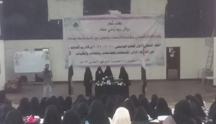 نظم القطاع النسائي بمؤسسة الشهداء بالتعاون مع جامعة صنعاء اليوم اللقاء الثقافي الأول لأسر الشهداء من الدرجة الأولى الملتحقات بالجامعات والمعاهد والكليات للعام الجامعي 2021م- 2022م .