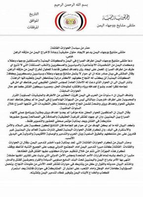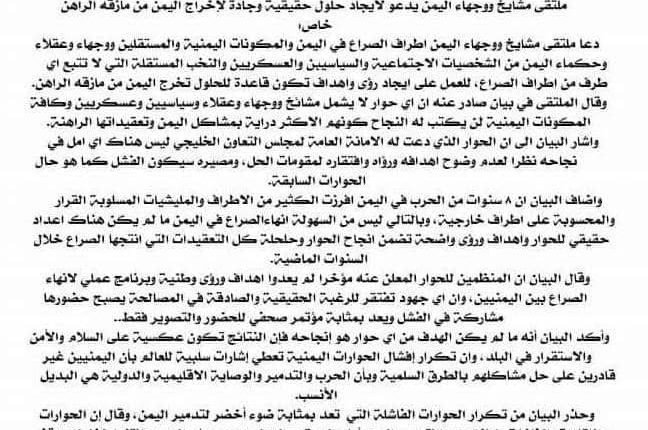 دعا ملتقى مشايخ ووجهاء اليمن اطراف الصراع في اليمن والمكونات اليمنية والمستقلين ووجهاء وعقلاء وحكماء اليمن من الشخصيات الاجتماعية والسياسيبن والعسكريين والنخب المستقلة للعمل على ايجاد رؤى واهداف تكون قاعدة للحلول تخرج اليمن من مازقه الراهن.