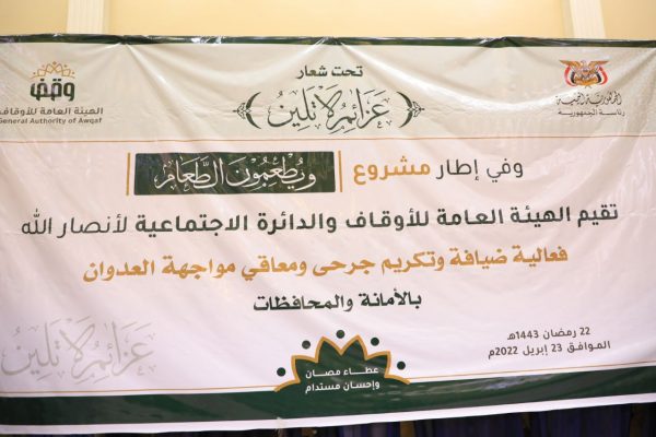 نظمت الهيئة العامة للأوقاف والدائرة الاجتماعية لأنصار الله اليوم، فعالية خطابية ومأدبة إفطار وتكريم لجرحى ومعاقي العدوان بالأمانة والمحافظات تحت شعار ” عزائم لا تلين”.