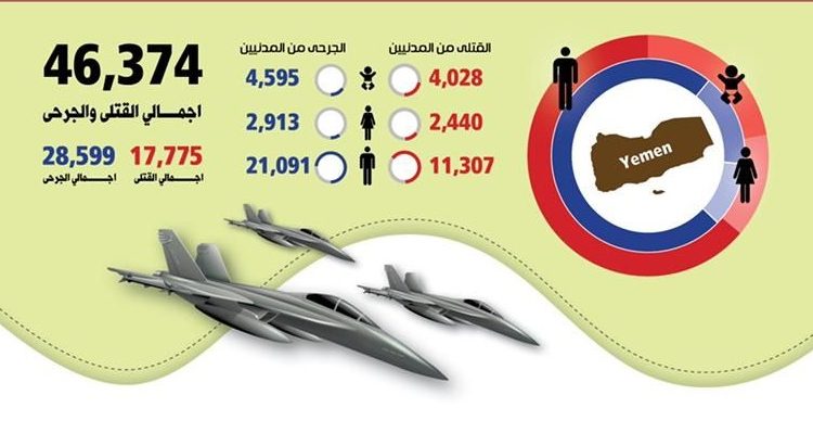 استشهاد وجرح 46,374 مواطنا بينهم 8 آلاف و623 طفلا بغارات العدوان خلال 2600 يوم