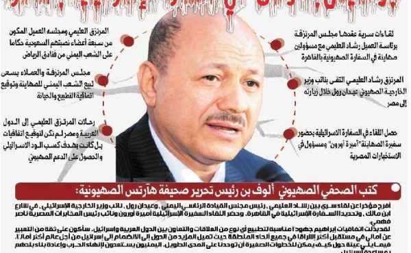 وحسب الكاتب الصهيوني فقد التقى العليمي بنائب وزير الخارجية الصهيوني عيدان رول خلال زيارته إلى مصر، في السفارة “الإسرائيلية” بحضور سفيرة الصهاينة “أميرة أورون” ومسؤول في الاستخبارات المصرية، وتم بحث التطبيع وسبل الدعم الصهيوني لحشد المرتزقة والعملاء.
