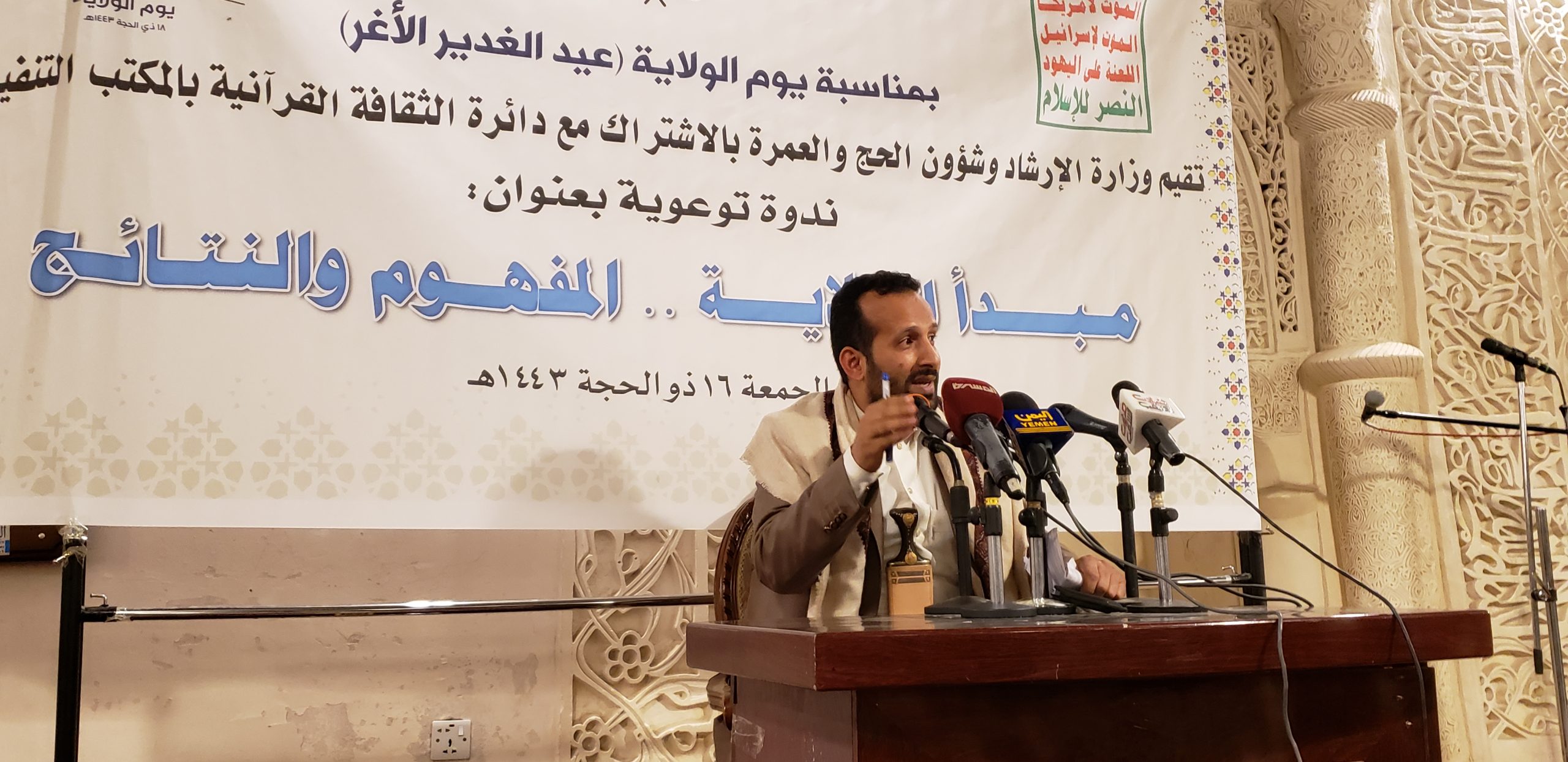 أقامت وزارة الإرشاد وشؤون الحج والعمرة بالاشتراك مع دائرة الثقافة القرآنية بالمكتب التنفيذي، مساء اليوم في الجامع الكبير بصنعاء ندوة ثوعوية بعنوان “مبدأ الولاية.. المفهوم والنتائج”وخلال الندوة،التى تضمنت محوريين حول مفهوم القرآن بمبدأ الولاية وأهمية ونتائج مبدأ الولاية وخطورة الإبتعاد عنها أشار نائب رئيس المجلس الشافعي رضوان المحياء إلى أنه من المهم فهم الولاية وربطها بالولاية الإلهية، التي ذكرها الله سبحانه وتعالي في كتابه الكريم في عدة آيات قرآنية، وحث الرسول صلى الله عليه وسلم المؤمنين على الولاية لله ورسوله والإمام علي.