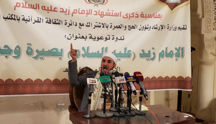 بمناسبة ذكرى استشهاد الإمام زيد عليه السلام أقامت وزارة الإرشاد وشؤون الحج والعمرة بالاشتراك مع دائرة الثقافة القرآنية بالمكتب التنفيذي مساء اليوم ندوة توعوية بعنوان “الإمام زيد عليه السلام بصيرة وجهاد ”