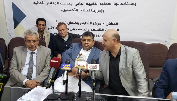 ولفت الدكتور القاسم إلى الانتهاء من عملية التقييم الذاتي لكافة الكليات والبدء بخطوات التصحيح والتطوير وخطط التحسين بناءً على نتائج التقييم وتشخيص الوضع الراهن من خلال المعايير الثمانية تمهيداً لاستكمال خطوات وإجراءات الحصول على الاعتماد المحلي والتقدم للحصول على الاعتماد الدولي.. مشيدا بدعم القيادة الثورية والمجلس السياسي الأعلى والحكومة لخطوات التطوير والتحديث لبرامج الجامعة.