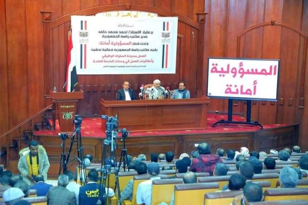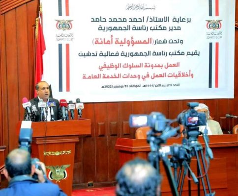 وفي التدشين، الذي حضره رئيس مجلس الشورى محمد العيدروس ونائبه عبده الجندي وأمين سر المجلس السياسي الأعلى الدكتور ياسر الحوري ونائب مدير مكتب الرئاسة فهد العزي ورئيس هيئة رفع المظالم الدكتور عبد الملك الأغبري وعدد من المسؤولين ورؤساء الدوائر في مكتب الرئاسة، قدّم رئيس دائرة الشؤون المالية والإدارية، توفيق أبو هادي، عرضا موجزا عن مدوّنة السلوك وأهدافها، وما تضمنته من نصوص تعزز وتقوي روح الولاء لله -عز وجل- ولرسوله الكريم، وتحسن وتسهل تقديم الخدمات للمواطنين.
