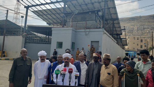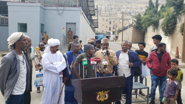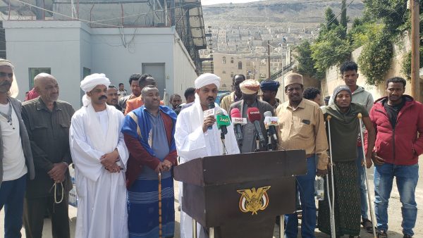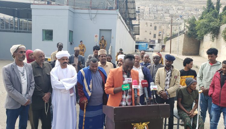 نظم أبناء الجاليات الأفريقية، اليوم الاثنين، مؤتمرا صحفيا أمام مكتب الأمم المتحدة بحضور عدد من الجرحى الأفارقة الذين أصيبوا بنيران القوات السعودية.