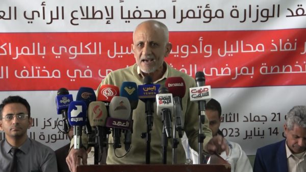 وأكد وكيل وزارة الصحة لقطاع الطب العلاجي الدكتور علي جحاف، في مؤتمر صحفي عقد بصنعاء، اليوم، أن اليمن يقف اليوم على أعتاب كارثة حقيقية تهدد حياة خمسة آلاف مريض بالفشل الكلوي مع نفاد مخزون أدوية الغسيل الكلوي من مخازن الوزارة.