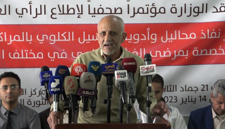 وطالب بيان المؤتمر الصحفي، الذي تلاه ناطق وزارة الصحة، الدكتور أنيس الأصبحي، طالب المنظمات الدولية والأممية بسرعة توفير جلسات غسيل كلوي بشكلٍ عاجلٍ لتستمر مراكز الغسيل في العمل وإنقاذ حياة المرضى.