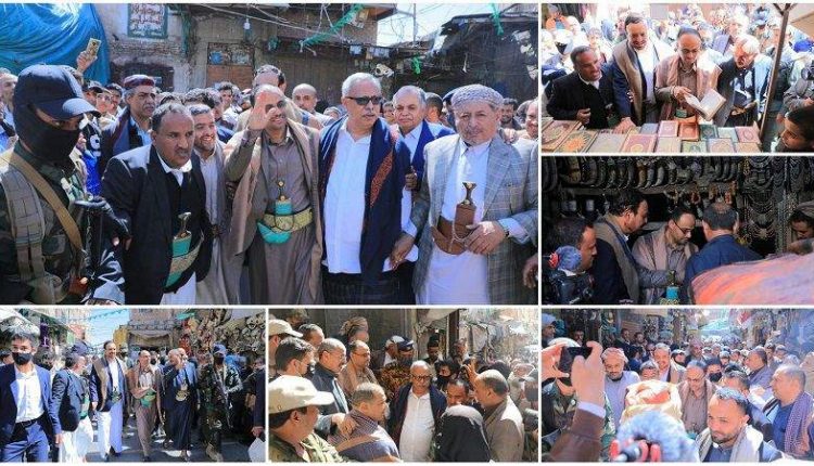 وتفقد الرئيس أحوال المواطنين في مدينة صنعاء القديمة، وزار سوق الحلقة، مؤكداً أهمية ترميم السوق لما له من دلالة إيمانية.