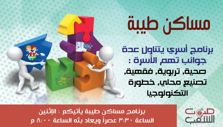 مساكن طيبة مساكن طيبة-1 في فبراير 13, 2023 مساكن طيبة أسري برنامج يتناول عدة جوانب تهم الأسرة ( صحية، تربوية، فقهية، تصنيع محلي، خطورة التكنولوجيا) https://www.sawtalshaab.com/wp-content/uploads/2023/02/مساكن-طيبة-ح-1-.mp3 شارك