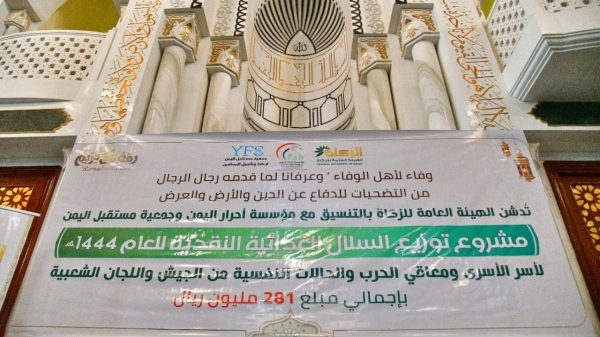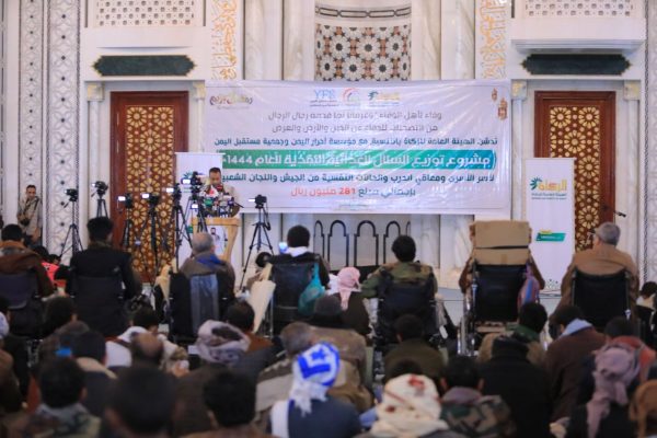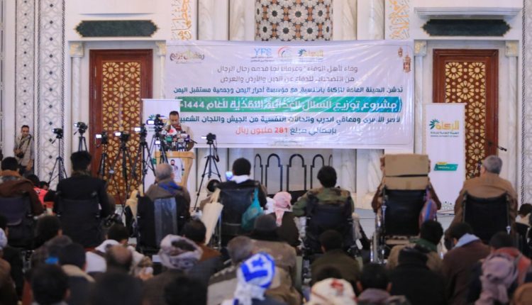 دشنت الهيئة العامة للزكاة، اليوم، بالتنسيق مع مؤسسة أحرار اليمن وجمعية مستقبل اليمن، مشروع توزيع السلال الغذائية النقدية لأسر الأسرى ومعاقي الحرب والحالات النفسية من الجيش بتكلفة إجمالية 281 مليون ريال.