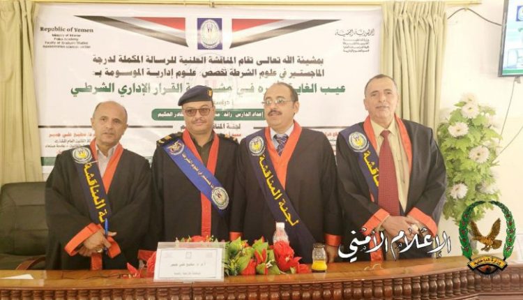 أجريت في كلية الدراسات العليا بأكاديمية الشرطة، المناقشة العلنية للرسالة العلمية المكملة لدرجة الماجستير في علوم الشرطة تخصص علوم إدارية والموسومة بـ”عيب الغاية وأثره في مشروعية القرار الإداري الشرطي” دراسة مقارنة بأكاديمية الشرطة للدارس الرائد منيب علي عبدالقادر الحكيم.