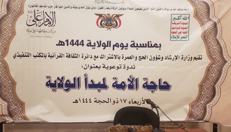 أقيم في الجامع الكبير بصنعاء، ندوة توعوية بعنوان وثقافية بعنوان “حاجة الأمة لمبدأ الولاية”. نظمتها وزارة الإرشاد وشؤون الحج والعمرة بالاشتراك مع دائرة الثقافة القرآنية بالمكتب التنفيذي. بمناسبة ذكرى عيد الغدير الاغر ولاية امير المؤمنين علي بن أبي طالب عليه السلام. وفي الندوة التي تضمنت محوريين لعضو رابطة علماء اليمن العلامة خالد موسى والناشط الثقافي الدكتور أحمد مطهر الشامي،