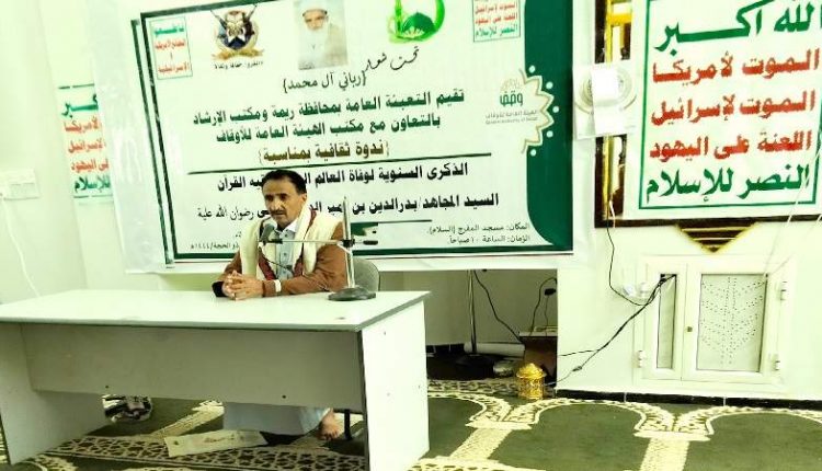 نظم مكتبا الهيئة العامة للأوقاف والإرشاد والتعبئة العامة بمحافظة ريمة، اليوم الثلاثاء، ندوة ثقافية في الذكرى السنوية لرحيل العلامة بدرالدين الحوثي.