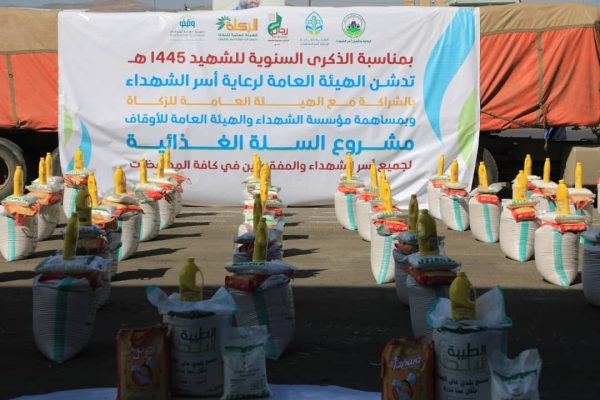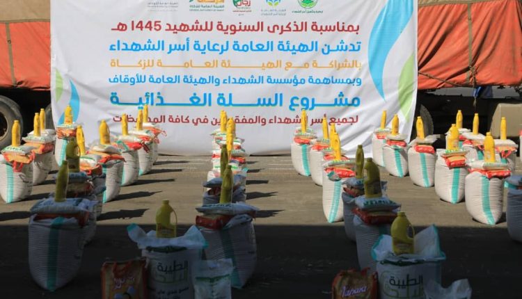 دشنت الهيئة العامة لرعاية أسر الشهداء بالشراكة مع هيئتي الأوقاف والزكاة وبمساهمة من مؤسسة الشهداء اليوم مشروع السلة الغذائية لجميع أسر الشهداء والمفقودين في كافة المحافظات بمناسبة الذكرى السنوية للشهيد 1445هـ.
