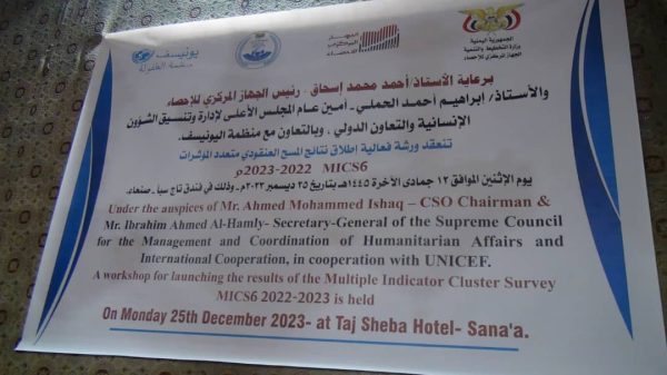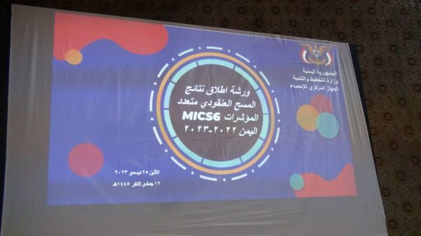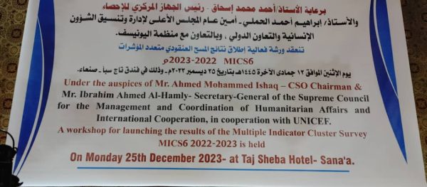 عُقدت بصنعاء اليوم، ورشة خاصة بإطلاق نتائج المسح العنقودي متعدد المؤشرات 2022- 2023م، الذي نفذه الجهاز المركزي للإحصاء بالتعاون مع المجلس الأعلى لإدارة وتنسيق الشؤون الإنسانية، ومنظمة اليونيسف والجهات الحكومية ذات العلاقة.