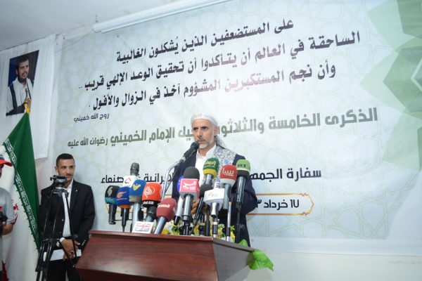 وتطرق إلى معاناة الإمام الخميني جراء محاربته من قبل المؤسسات الدينية آنذاك.. مبيناً أن “الكثيرين يصورون من يقوم بواجباته الدينية ويأمر بالمعروف وينهى عن المنكر، إنما هو صاحب مشروع فتنة وضلال، في حين أن الإمام الخميني والشهيد القائد، السيد حسين بدر الدين الحوثي، كانا من المجددين للأمة، وواجها قوى الاستكبار والصلف العالمي”.