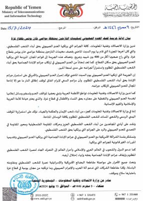 وزارة الاتصالات وتقنية المعلومات بصنعاء تدين مجزرة مواصي خان يونس وتدعو للتحرك الجاد ضد جرائم الاحتلال الصهيوني”