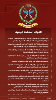 وجددت القوات المسلحة اليمنية التأكيد على أن كافة التحركات العسكرية الأمريكية في منطقة العملياتِ البحرية دعماً للعدوِّ الإسرائيليِّ تعتبر تحركات معاديةً ولن تترددَ بعونِ اللهِ تعالى في استهدافِ تلكَ التحركاتِ وبكافةِ الوسائلِ المتاحة.