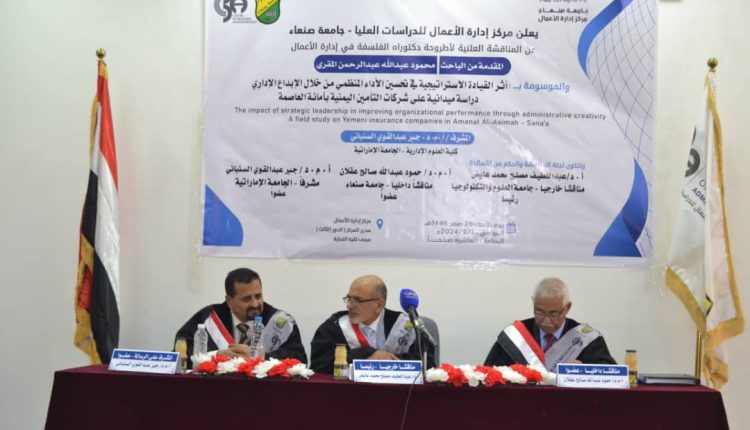 حصل الباحث محمود عبدالله عبدالرحمن المقري على درجة الدكتوراه من مركز إدارة الأعمال بجامعة صنعاء عن أطروحته الموسومة بـ ” أثر القيادة الاستراتيجية في تحسين الأداء المنظمي من خلال الإبداع الإداري” .. دراسة ميدانية على شركات التأمين اليمنية بأمانة العاصمة صنعاء.