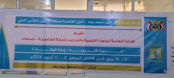 اختُتمت اليوم بصنعاء دورة تدريبية متخصصة في إدارة الوقت، نظّمتها الإدارة العامة لبحوث التنمية والتدريب على مدى ستة أيام، بمشاركة 38 موظفًا من ديوان أمانة العاصمة والمديريات والمكاتب التنفيذية التابعة لها.