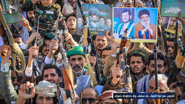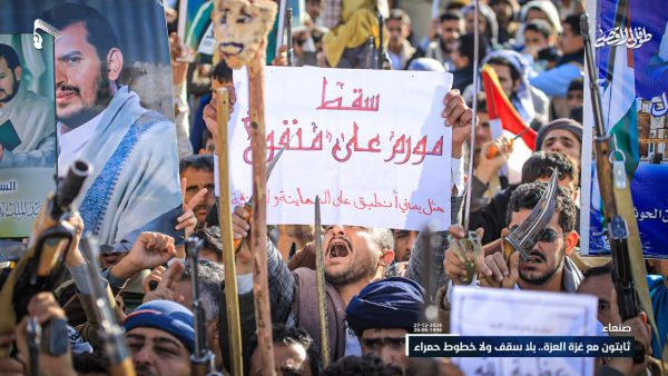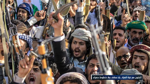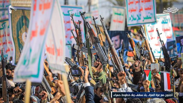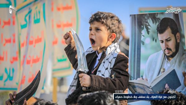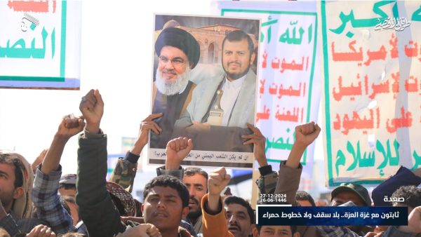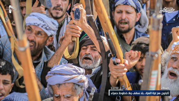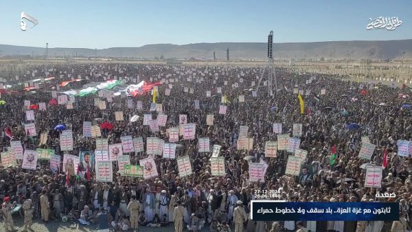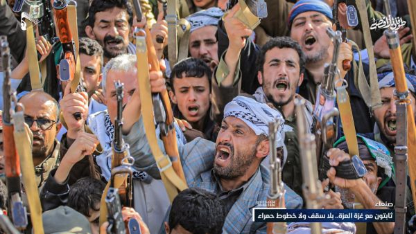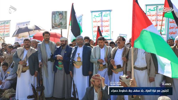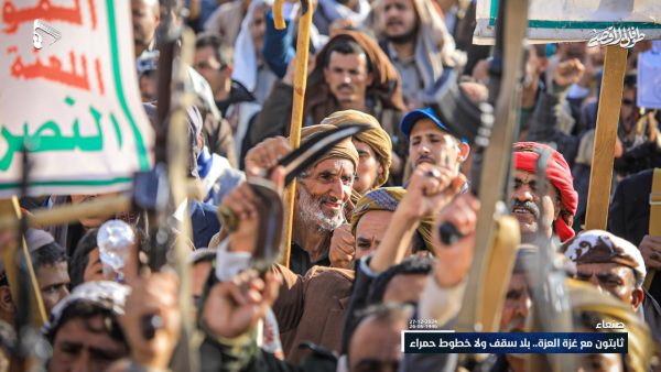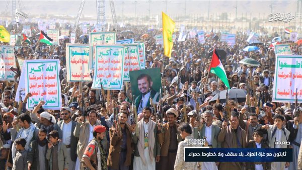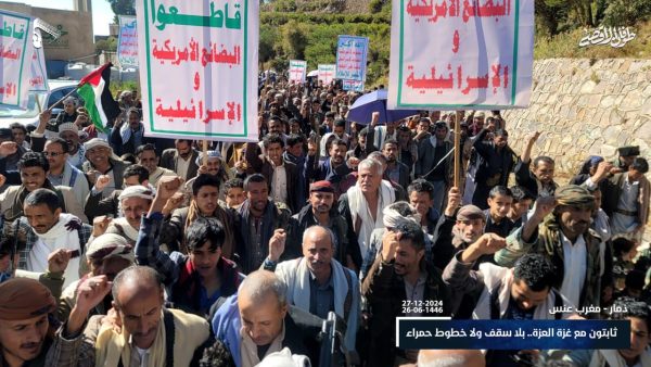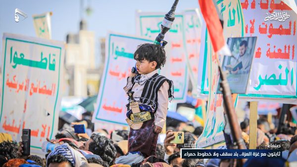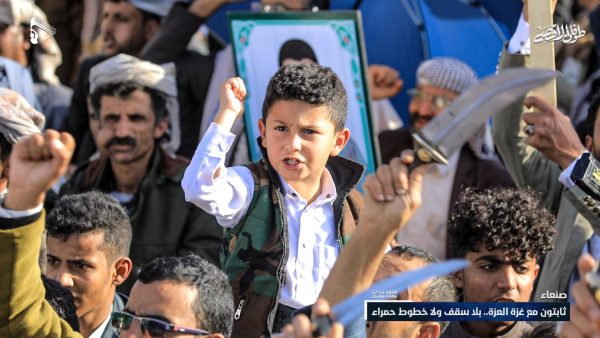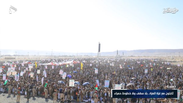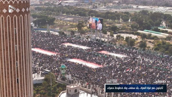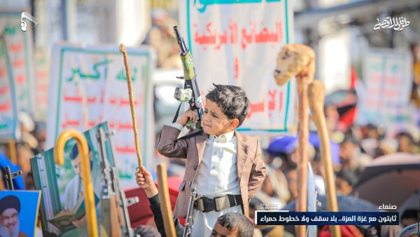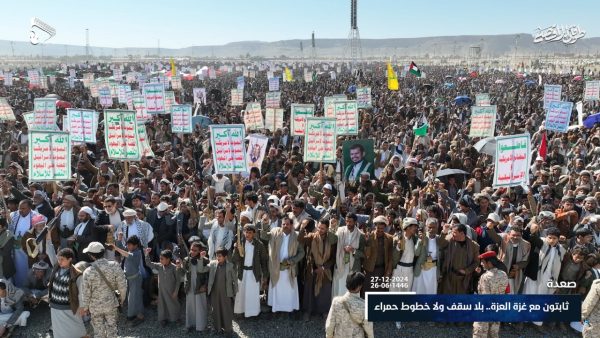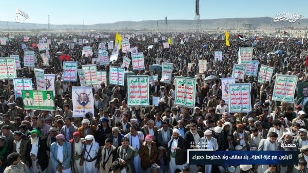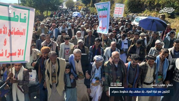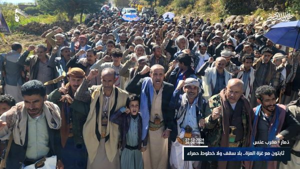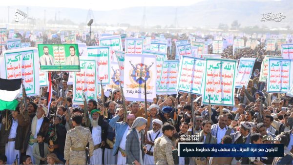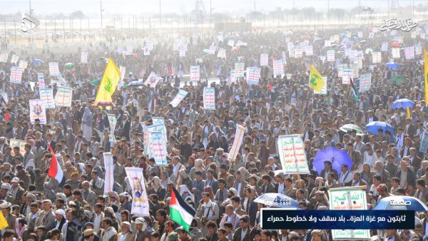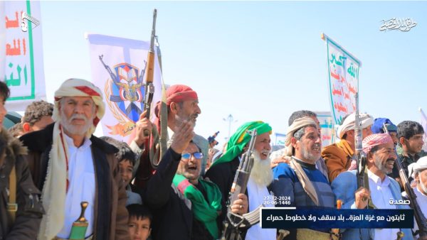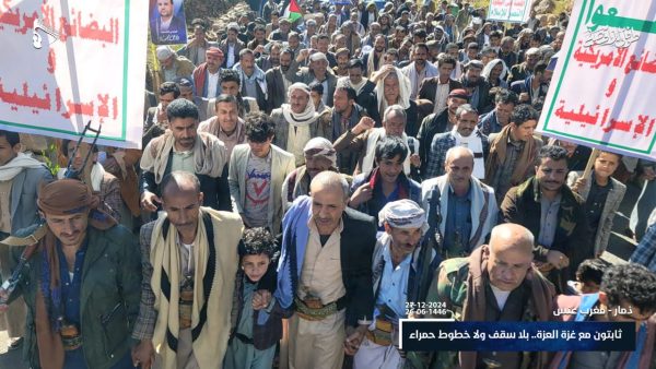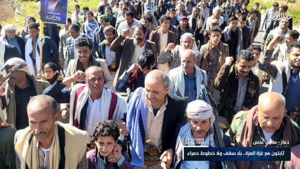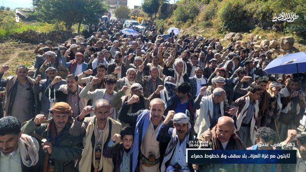 ورددت هتافات ” يا أمريكي يا صهيوني.. يتحداك الشعب اليمني، مع غزة سنصعد أكثر لا سقف ولا خط أحمر، دمي يمني وفلسطيني عربي مسلم يا صهيوني، القوة العظمى المزعومة هربت مذعورة مهزومة، يا غزة يا فلسطين ..معكم كل اليمنيين، بالله ووعي الشرفاء.. ورجال الأمن الأكفاء.. أفشلنا مكر الحلفاء، معركة الفتح الموعود.. ليس لها سقفٌ وحدود، يمن الحكمة والايمان.. يضرب في عمق الكيان، يا غزة واحنا معكم.. أنتم لستم وحدكم، فوضناك فوضناك.. يا قائدنا فوضناك.